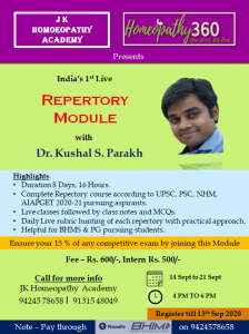India’s 1st Live Repertory Module By JK Homoeopathy Academy And Homeopathy 360Repertory Module by Dr Kushal S. Parekh Highlights•Duration 8 Days, 16 Hours. •Complete Repertory course...
