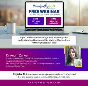Homeopathy 360 Free Webinar Topic: Antispasmodic Drugs And Homoeopathy: Understanding Homoeopathic Materia Medica From Pathophysiological View  Speaker Dr Anum ZaheerB.H.M.S (Gold Medalist), State K.G.K.Homoeopathic Medical College...