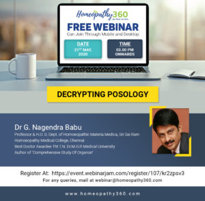 Homeopathy 360 Free WebinarTopic: Decrypting Posology Speaker:  Dr G. Nagendra BabuProfessor & H.O. D. Dept. of Homoeopathic Materia Medica, Sri Sai Ram Homoeopathy Medical College, Chennai Best Doctor Awardee,...