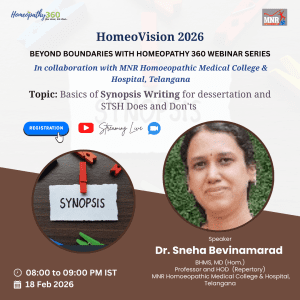 “HomeoVision 2026” Join us for the upcoming webinar on “Synopsis writing” in the ‘HomeoVision 2026’ series, presented by Homeopathy360 in collaboration with MNR Homoeopathic Medical...