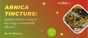 Today Clinical Tips Arnica Tincture: Dr. M. Blackey ARNICA TINCTURE: Applied neat to a wasp or bee sting is wonderfully effective. Searching tags: #ARNICATINCTURE, #DrMBlackey,...