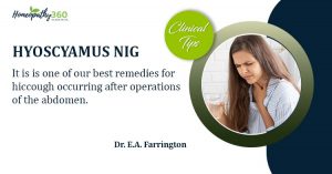 Hyoscyamus Nig : Today Clinical Tips by Dr. E.A. Farrington HYOSCYAMUS NIG.: It is one of our best remedies for hiccough occurring after operations of...