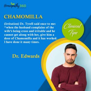 Chamomilla: Dr. Edwards CHAMOMILLA: (Irritation) Dr. Tyrell said once to me: “when the husband complains of the wife’s being cross and irritable and he cannot...