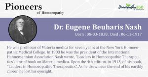 Stalwarts’ Segment: Dr. Eugene Beuharis Nash Born: 08-03-1838 Died: 06-11-1917 He was professor of Materia medica for seven years at the New York Homoeopathic Medical...