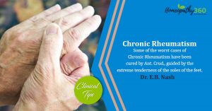 Chronic Rheumatism: Clinical Tips by Dr. E.B. Nash Some of the worst cases of Chronic Rheumatism have been cured by Ant. Crud., guided by the...