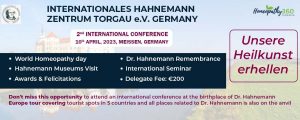 Internationales Hahnemann Zentrum Torgau E.V. Germany Unsere Heilkunst erhellen (Enlighten our healing art) 2ND INTERNATIONAL CONFERENCE on 10th APRIL, 2023, MEISSEN, GERMANY on the occasion...