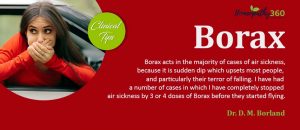 Borax: Clinical Tips by Dr. D. M. Borland Borax acts in the majority of cases of air sickness, because it is sudden dip which upsets...
