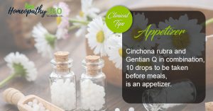 Appetizer: Clinical Tips by Dr. Ellis Barker Cinchona rubra and Gentian Q in combination, 10 drops to be taken before meals, is an appetizer. Searching...