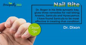 Nail Bite: Clinical Tips by Dr. Dixon Dr. Roger in his little synoptic key, gives three remedies for nail biting; Arsenic, Sanicula and Hyoscyamus. I...