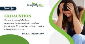 Exhaustion: Clinical Tips by Dr. Charles C. Boericke Senna is one of the best remedies in the materia medica for simple exhaustion with excessive nitrogenous...