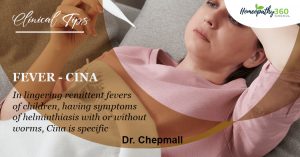 Fever – Cina: Clinical Tips by Dr. Chepmall In lingering remittent fevers of children, having symptoms of helminthiasis with or without worms, Cina is specific....