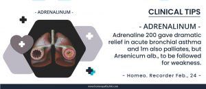 Adrenalinum Today Clinical Tips Adrenaline 200 gave dramatic relief in acute bronchial asthma and 1m also palliates, but Arsenicum alb., to be followed for weakness....