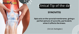 Synovitis: Clinical Tips by Dr. E.A. Farrington Apis acts on the synovial membranes, giving a perfect picture of synovitis, particularly when it affects the knees....
