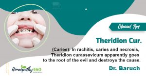 Theridion Cur.: Clinical Tips by Dr. Baruch (Caries): In rachitis, caries and necrosis, Theridion curassavicum apparently goes to the root of the evil and destroys...