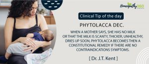 Phytolacca Dec: Clinical Tips by Dr. J.T. Kent When a mother says, she has no milk or that the milk is scanty, thicker, unhealthy, dries...