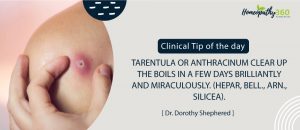 Tarentula or Anthracinum clear up the boils in a few days brilliantly and miraculously. (Hepar, Bell., Arn., Silicea). [Dr. Dewey] Read More Clinical Tips: https://www.homeopathy360.com/...