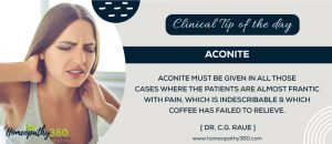 Aconite: Clinical Tips by Dr. C.G. Raue Aconite: Aconite must be given in all those cases where the patients are almost frantic with pain, which...