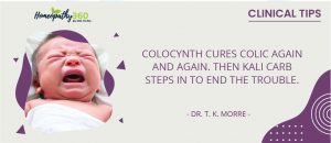 Colocynth: Clinical Tips by Dr. T. K. Morre Colocynth: Colocynth cures colic again and again. Then kali carb steps in to end the trouble. [Source:...