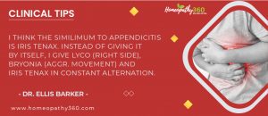 Similimum: Clinical Tips by Dr. Ellis Barker  Similimum – I Think the Similimum to Appendicitis Is Iris Tenax. Instead Of Giving It By Itself, I...
