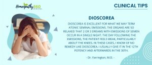 Clinical Tips for Today: Dioscorea: DIOSCOREA i s excellent f or atonic seminal emissions. Organs are so relaxed that 2 or 3 dreams with emissions...