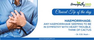 Clinical Tips for Today: Haemorrhage – Any Haemorrhage seeming to be in sympathy with heart trouble, think of Cactus. [Source: – Dr. E.B. Nash] Read...