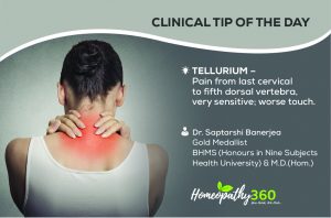 TELLURIUM – Pain from last cervical to fifth dorsal vertebra, very sensitive; worse touch. BY Dr. Saptarshi Banerjea Gold Medalist (BHMS (Honors in Nine Subjects...