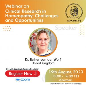 Webinar on Clinical Research in Homeopathy: Challenges and Opportunities Speaker: Dr Esther van der Werf Date: Aug 19, 2023 Time: 15:00 – 16.30 CET Registration...