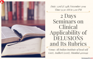 2 Days Seminars on Clinical Applicability of DELUSIONS and Its Rubrics by Dr.Yogesh Sehgal Date: 23rd & 24th November 2019 Time: 9.30 AM to 5.00 PM...