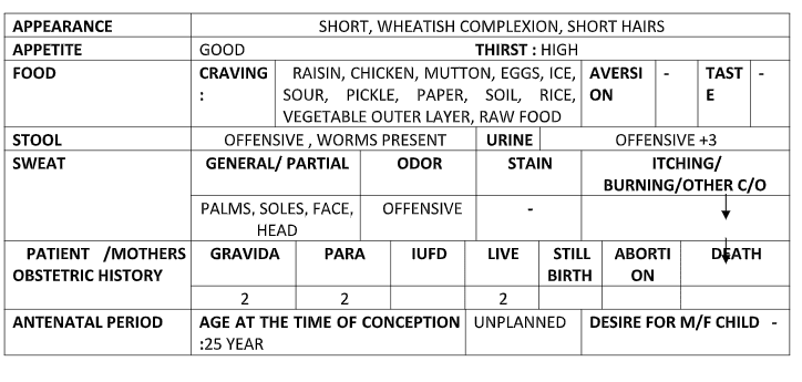 Childhood:- patient is very cool and jolly in nature but she is also very obstinate+3. She speaks very much. She is very selfish+2. She doesn’t care about others. She has only concern with her work. She will please and call someone until she needs them. Once her work is over she will ignore them and do her work. She is very restless. She never takes anything to services. She becomes irritable+3 when get angry. When she becomes angry she goes to the room and does drama, digs her mouth in between the blanket and pillow and closes the room. She doesn’t have an attachment with anyone. If someone scolds her then she escapes the place and runs away and doesn’t listen to her mother. She doesn’t accept her mistake and tells lies. She has fear of height+3, swing+3.  She likes to get ready and wants to wear princess dresses, likes shopping+3, lipstick, and dance. She has dreams of gold, princesses and fairy tales.