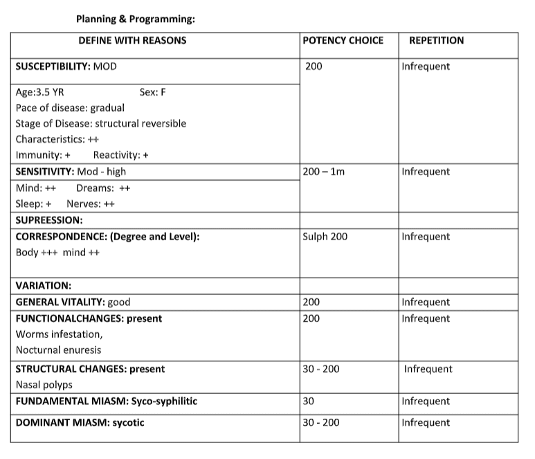 In cases of recurrent worm infestation, homoeopathic physicians consider not only the presence of parasites but also the constitutional characteristics of the child. Treatment is selected based on: