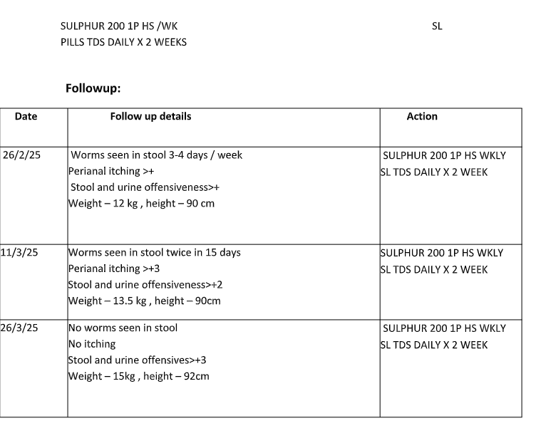 This article presents a detailed case of chronic worm infestation in a 3.5-year-old child with persistent anal itching, poor growth despite good appetite, offensive discharges, and characteristic behavioral traits. Based on totality of symptoms and repertorial analysis, Sulphur 200 was prescribed with subsequent clinical improvement and disappearance of worms.