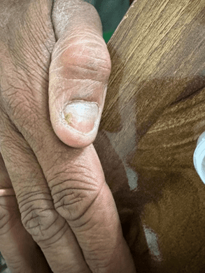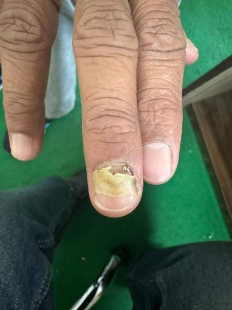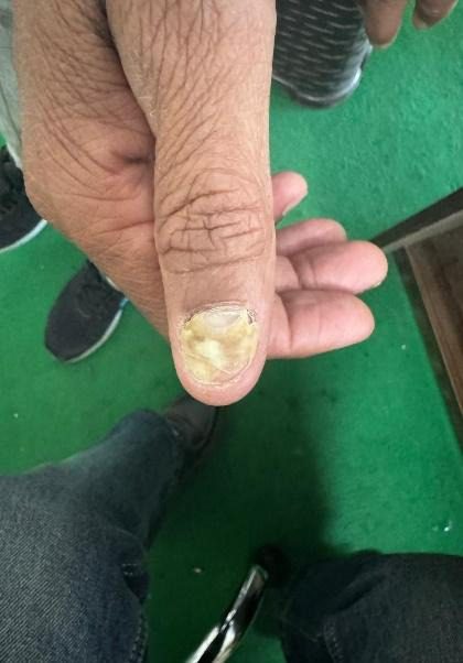 • Nail complaint: New nail growth is visibly clearer. Patient himself notices it and is hopeful. Old thick portion is still present but starting to push outward.