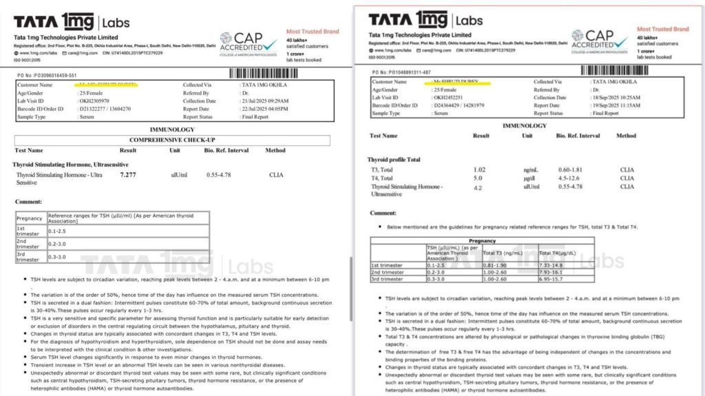 | 20-09-25 | She was better, fatigue and tiredness reduced also TSH levels drops to 4.2 | Placebo BD 10 days |