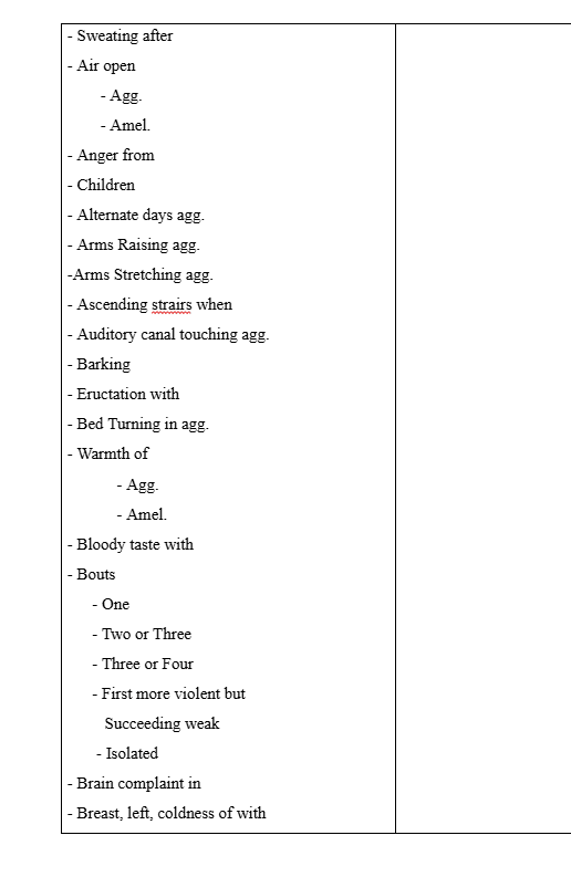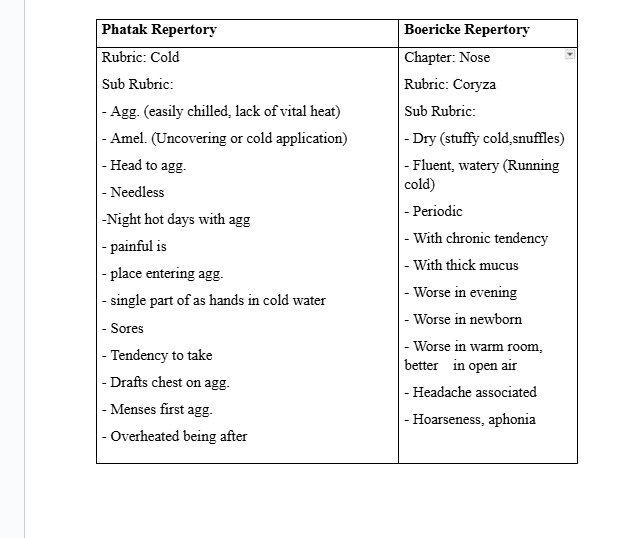 Reportorial Approach:. Two repertories that are commonly utilized for acute illness are Phatak and Boericke. The various rubrics that have been mentioned in these two repertories are given below: