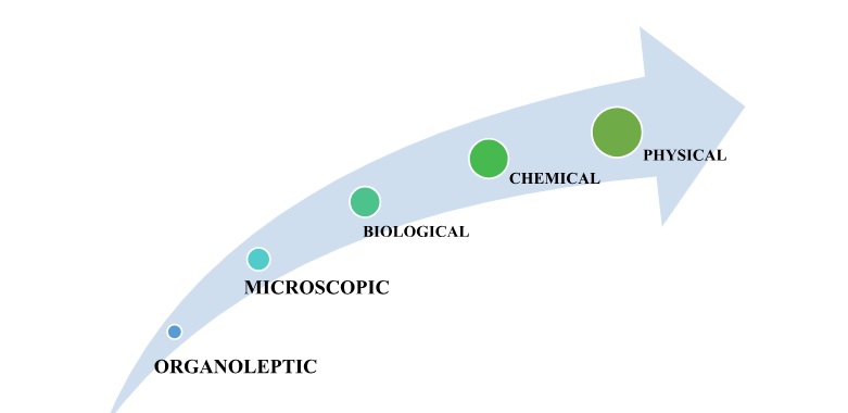 - Fluorescence test – solubilities, specific gravity, refractive index, melting point, congealing point, optical rotation, water content or loss on drying