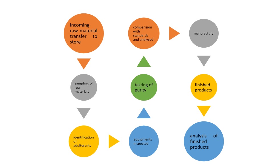 Quality control is referred to the processes involved in maintaining the quality and validity of a manufactured product1. The quality should be tested right from the receipt of raw materials till the final packaging. It includes quality specifications, correct ingredients in correct proportions, up to date purity, processed as specified in different pharmacopoeias, packaged in a proper container, proper labelling and storage for maintaining the proper quality1,6. Prime factors that play a vital role in quality control are materials, personnel, equipment’s, environments, methods and infrastructure1.
