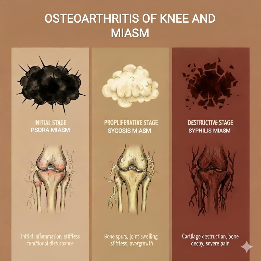 Osteoarthritis knee is not merely a mechanical wear-tear disease but a chronic constitutional disease reflecting deep-seated miasmatic influences. The pathological changes observed in knee osteoarthritis correspond closely with the miasmatic evolution as decribed by Hahnemann. A Homoeopathic approach, grounded in the understanding of pathology and miasmatic background, enables the physician to treat the patient holistically rather than focusing solely on the affected joint.