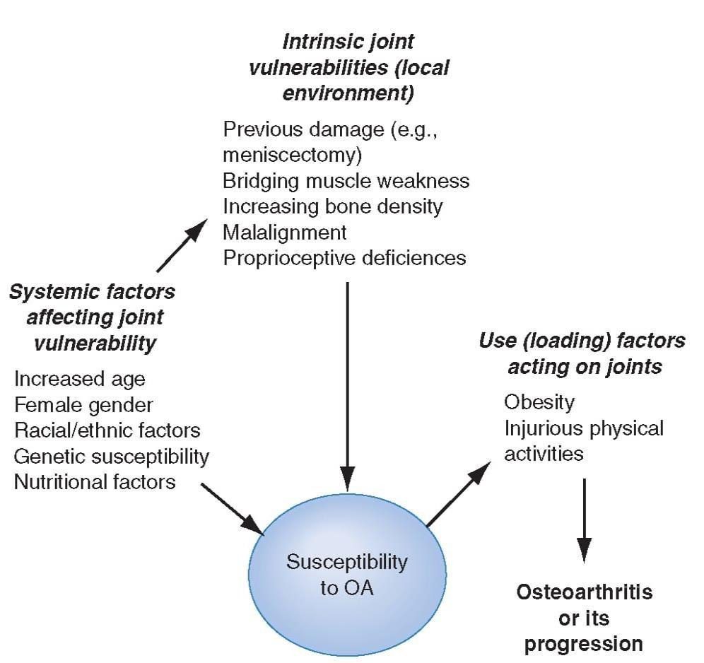 Figure– Risk factors for osteoarthritis (OA) either contribute to the susceptibility of the joint (systemic factors or factors in the local joint environment) or increase risk by the load they put on the joint. Usually a combination of loading and susceptibility factors is required to cause disease or its progression.