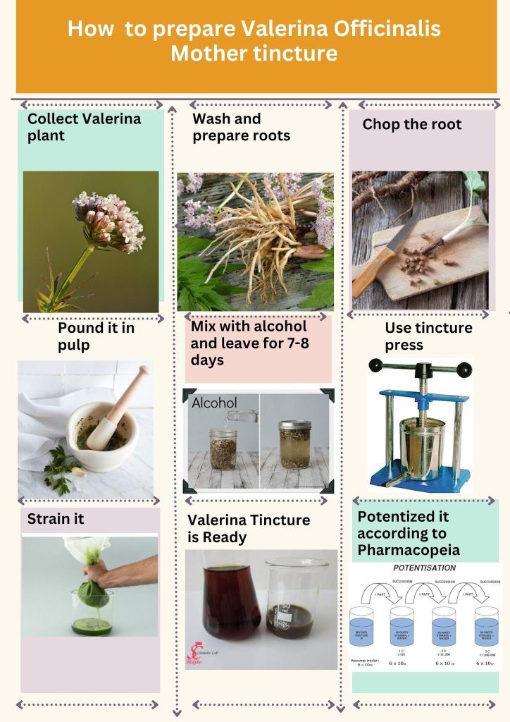 In homoeopathic pharmacy during the preparation of Valerina Officinalis, parts that are used are roots and rhizomes. It is prepared under the Class I (juice of fresh plant) of Homoeopathic Pharmacopeia of India (9) Further it is potentised according to scales mentioned in a textbook of homoeopathic pharmacy.