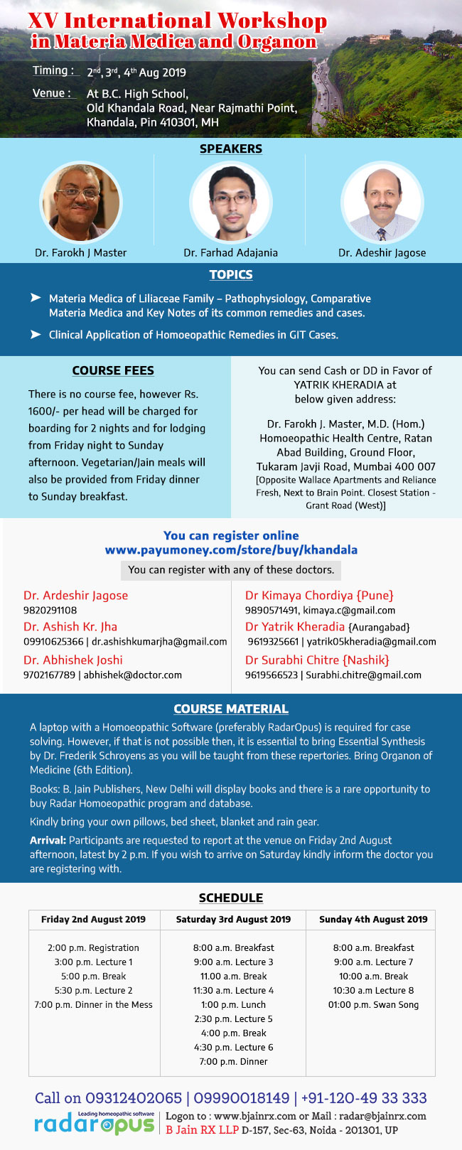 Course material: A laptop with a Homoeopathic Software (preferably Radar) is required for case solving. However, if that is not possible then, it is essential to bring Essential Synthesis by Dr Frederik Schroyens as you will be taught from these repertories. Bring the Organon of Medicine (6th Edition).